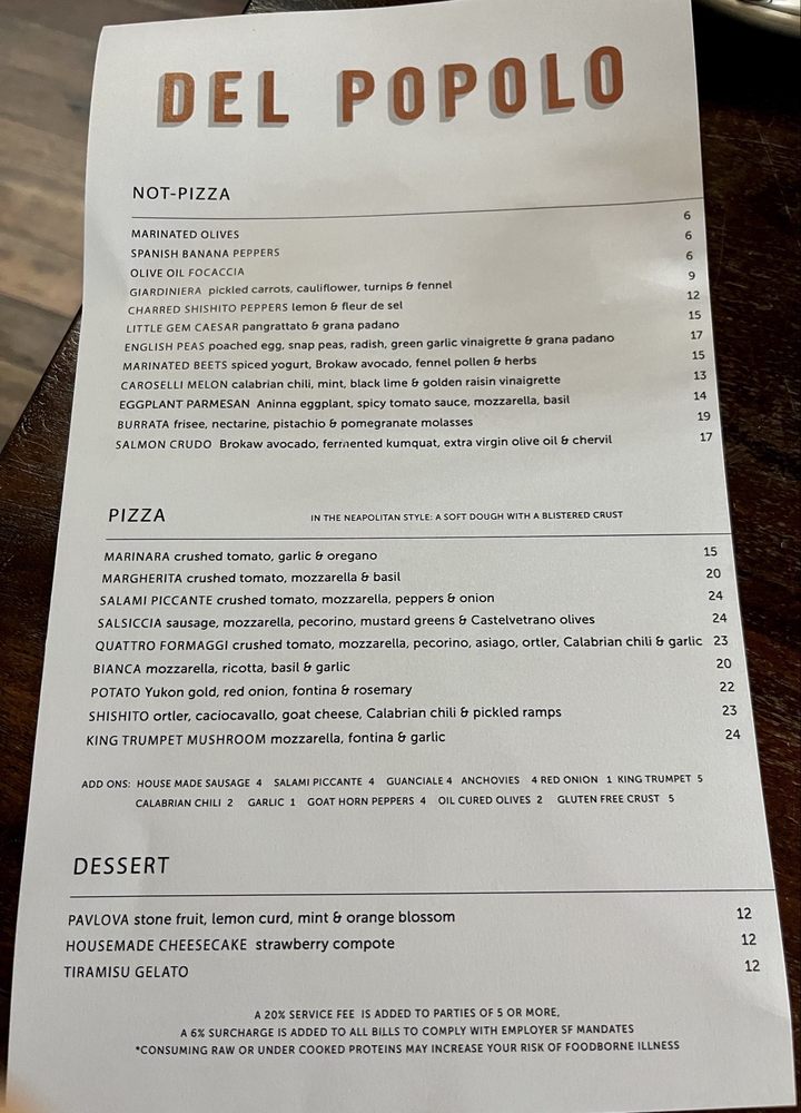 Del Popolo, located in San Francisco, is a trendy pizza spot that caters to a variety of dietary needs with its vegan and vegetarian options. The restaurant offers a cozy ambiance with friendly staff who provide great wine recommendations. The wood-fired pizzas at Del Popolo are a standout, known for their crispy thin crust and flavorful toppings. The wine menu is impressive, featuring unique selections that pair well with the delicious pizzas. Customers rave about the chewy and soft crust, as well as the creative toppings like king trumpet mushrooms. The quirky decor adds to the overall dining experience, making it a memorable place to visit. Whether you're looking for a quick bite before a show or a spot for a date night, Del Popolo delivers on quality and taste.